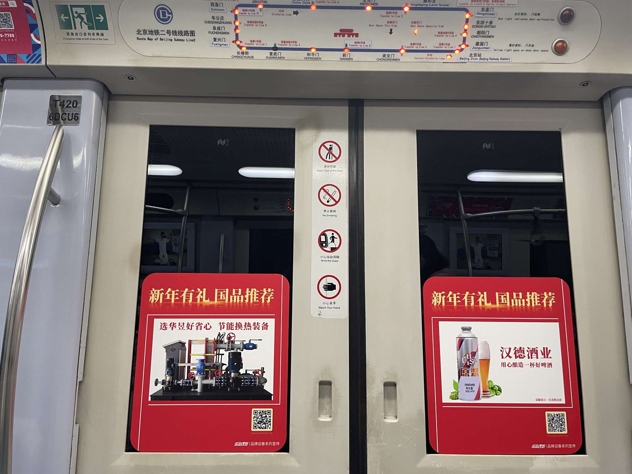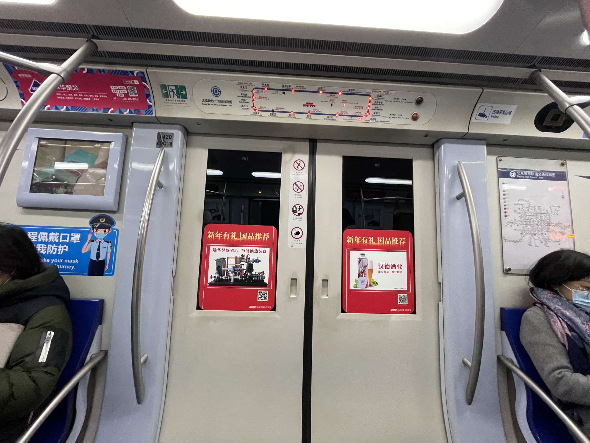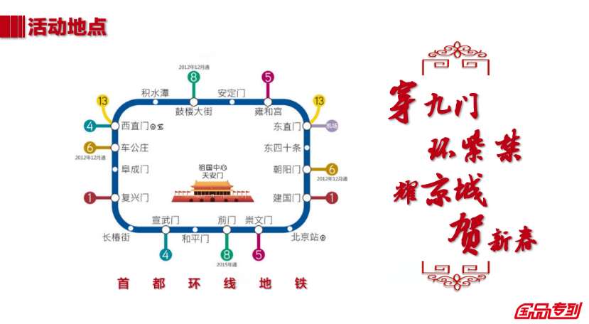 1月26日,“国品迎春专列”在北京地铁二号线开行,数百个优秀国货品牌受邀参加“穿九门·环紫禁·送年货”新年有礼国品推荐活动。活动将从2022年1月26日一直持续到2022年2月22日,国品专列平均每天开行18圈,穿越德胜门、西直门、崇文门等九门,每天近5万人次乘坐。