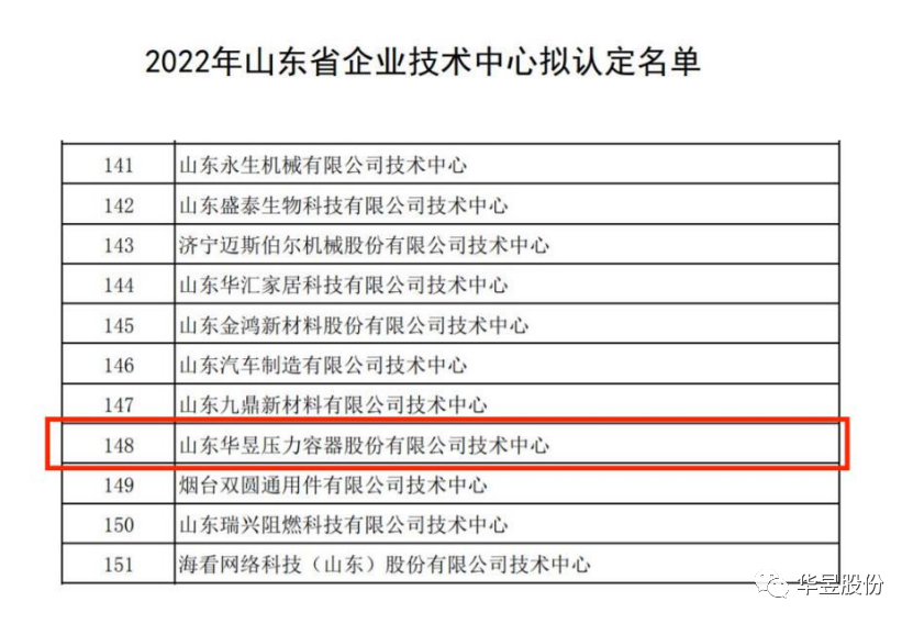 2022年9月28日,山东省发展和改革委员会发布通告,山东华昱压力容器股份有限公司获评“山东省企业技术中心”。