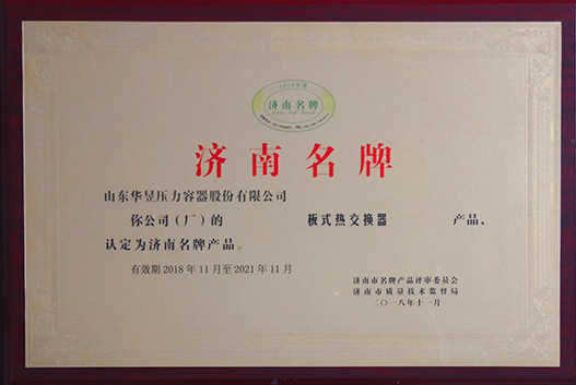 经济南市质量技术监督局、济南市名牌产品评审委员会评审,并广泛征求社会及消费者意见,近日,《2018年济南市名牌名单》正式公布,山东华昱压力容器股份公司生产的“板式热交换器”产品凭借高质量的产品和良好的口碑,在众多参评单位中脱颖而出,荣获“济南名牌产品”称号。为济南市的压力容器行业群起到了表率作用。济南名牌的获得不仅是济南质量监督部门对山东华昱的高度认可,更是彰显了山东华昱品质,反映了山东华昱实施“名牌战略”所带来的显著成效。