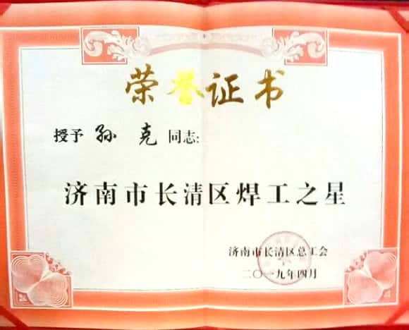 当好主力军,建功新长清! 4月24日上午,长清区在区委会议厅隆重召开庆祝“五一”国际劳动节暨五一劳动奖和工人先锋号命名大会,会上对全区五一劳动奖状、五一劳动奖章和“工人先锋号”“工友创业园”、“农民工之星”、和“焊工之星”进行了表彰。此次表彰中,公司荣获“五一劳动奖状”先进集体,公司员工孙克获得“焊工之星”荣誉称号。