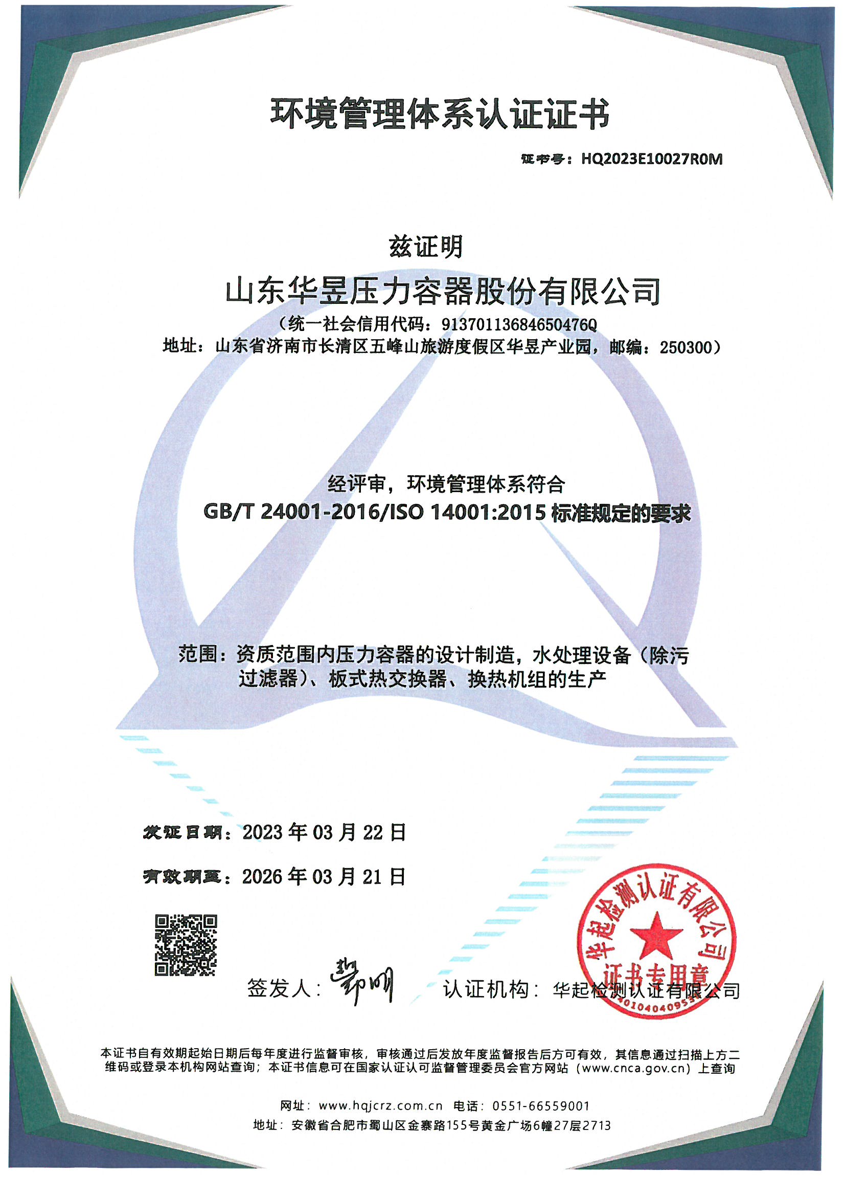 环境管理体系认证证书