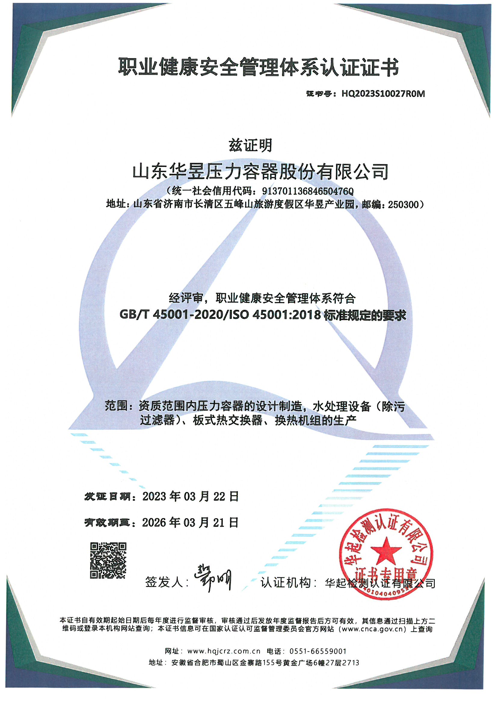 职业健康安全管理体系认证证书