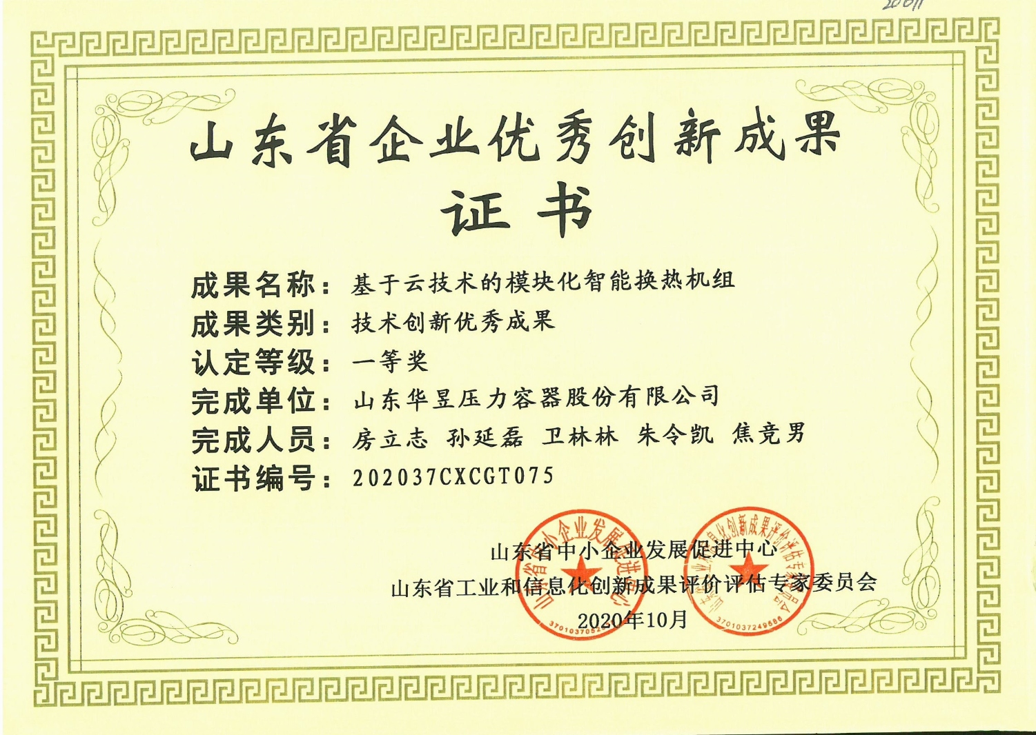 山东省企业优秀创新成果证书