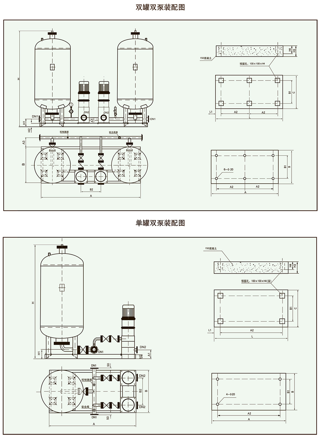 举例:罐体直径为1600mm.罐体个数为1.水泵吸入口径为50mm.水泵数量为2.水泵级数为3级的囊式落地
